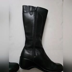 Elegant knee-high boots. Sleek black leather. Perfect for any occasion.