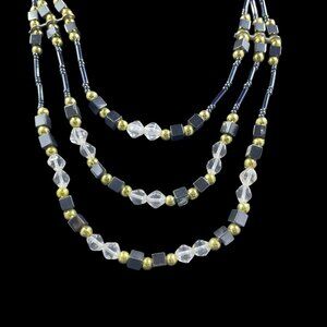 Vintage Style Multi Strand Beaded Necklace Black Gold Clear Boho Layered 17.5"