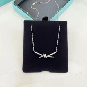 The Tiffany & Co. Knot Pendant Necklace is a chic and sophisticated accessory that embodies modern elegance. Crafted in polished silver, this necklace features a delicate knot design encrusted with sparkling diamonds, adding a touch of luxury to any ensemble. Perfect for everyday wear or special occasions, this piece is a timeless symbol of refined style and craftsmanship.