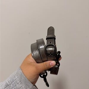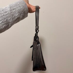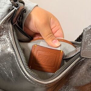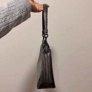 Stylish Coach shoulder bag in metallic gray leather. Features a chic chain detail and sleek design.