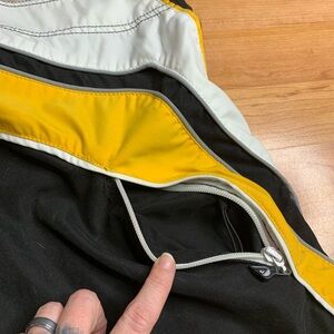 Elevate your beach or pool game with these classic Quiksilver board shorts! Featuring a bold tri-color block design in black, vibrant yellow, and crisp white.
