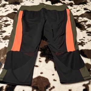 Stylish colorblock leggings with bright coral color and army green accents. Features a black mesh cut out near the bottom of the legs. Perfect for workouts. Size is 18/20 in women’s. These also feature a thick waist band for tummy control.