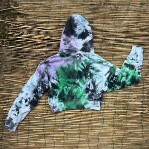 tie-dye, graphic print, fleece interior, vintage vibe, concert merch, 1970s style, music-inspired, colorful pattern, cropped fit, psychedelic