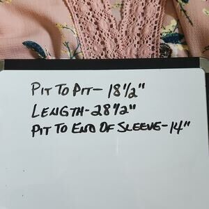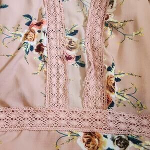 Dusty rose with multi-colored flowers. Beautiful bell cuffs. Lace trim throughout. No brand. 65% Cotton 35%Polyester. EUC