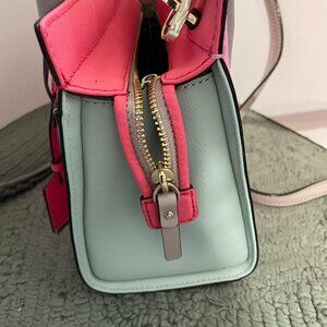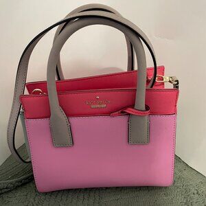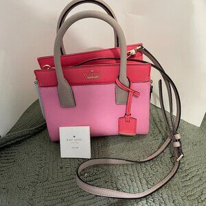 The handbag in the image is a Kate Spade Cameron Street Mini Candace satchel, typically made from crosshatched leather. It features a color-block design, with the primary colors in the image being a pink shade (sometimes called "eraser pink multi", "punch hot pink", or "blush/crisp linen") and a light gray or taupe for the handles and accents.