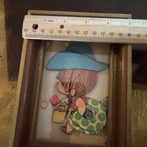 Wooden frame with 3D paper art featuring little going to the beach wearing a blue hat carrying bucket,shovel, truck and tube wire Hyundai the back smoke/pet free home