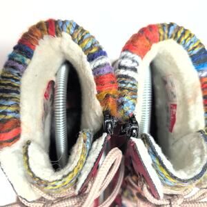These Rieker Felicitas ankle boots bring a warm, eclectic energy to cold-weather dressing with their deep burgundy red leather and vibrant multi-colored knit accents. The rich, weathered finish of the leather paired with the thick rainbow sweater cuff creates a cozy, artisanal look that stands out in a sea of plain winter footwear. A plush white sherpa lining peeks out from the top, promising a soft and insulated environment for your feet during long walks or crisp outdoor market visits.