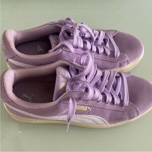 Stylish Puma sneakers. Lavender upper with white accents. Comfortable and trendy.