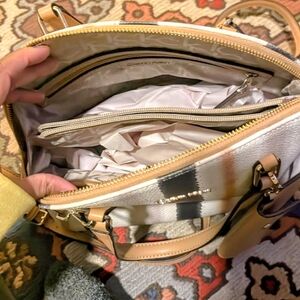 Stylish satchel with bold stripes. Features a matching cardholder. Perfect for any occasion.