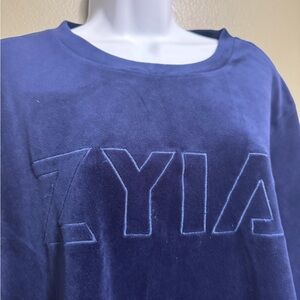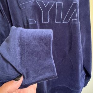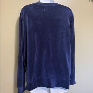 Zyia Active Velour Sweatshirt, Size 2XL. Dark navy blue, very soft inside and out. Emblem etched on front and moon etched on top of the back. Bust measures 50 inches and the length from shoulder to hem is 27 inches.