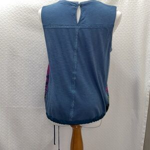 Features dark floral colors of purple, blue and gold, round neck, lace, sleeveless Top. This top has a side tie with a keyhole button closure on the back.