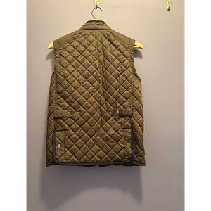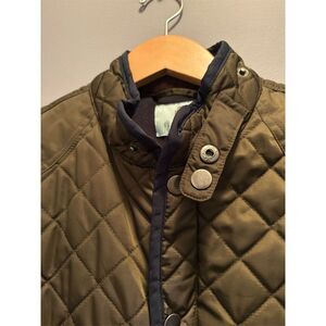 This Classic Club quilted vest for boys is designed for casual fall wear. It features a secure zip front, two front pockets, and a name tag. Made from polyester, both the outer shell and lining ensure durability and comfort. The vest is olive green and machine washable for easy care. It is available in size 14/16. This item is pre-owned.