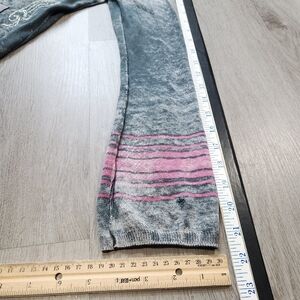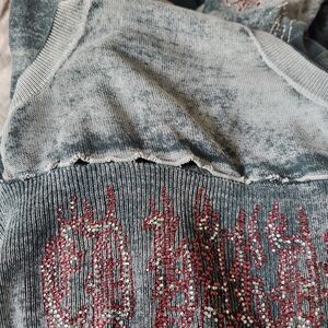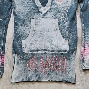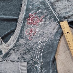 Vintage Ed Hardy long sleeve top, gray grungy deep v neck shirt. Shirt is in used condition, pocket have damage and need sewing. Hole on left sleeve end and other wear. Rhinestones on front and a big rhinestone skull on back with pink and white design. See pictures for damage and sizing.