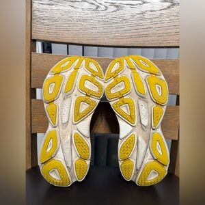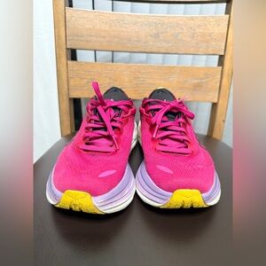 Bold fuchsia and lavender shoes by Hoka. Ideal for running.