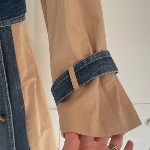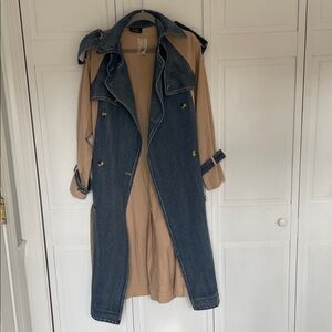 Unique denim and tan trench coat perfect for spring. Features a classic double-breasted design with a matching belt for a tailored fit. Collar and front panel are denim with shoulder and arm cuff denim details. It has pockets. Slits on each side and in the back. Back panel and sleeves are khaki. Like new with extra button still attached to brand tag. No known flaws. Approximately 45inches long, 21.5inches from armpit to armpit, 24 inch sleeves.