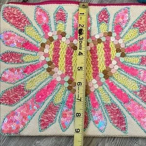 Chic clutch with vibrant sequin heart design. Features multicolor patterns. Ideal for stylish outings.