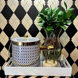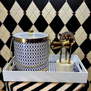 Blue & White Ice Bucket & Tray Set with Gold Trim | Bar Cart Glam