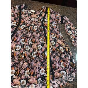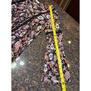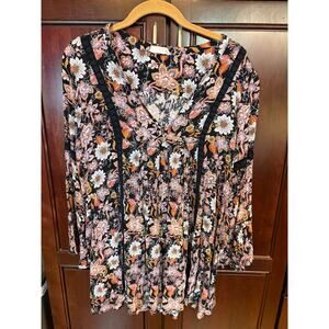 Alter'd State boho inspired floral mini dress with long bell sleeves. V-neck. Black base with pink, white and tan floral pattern. Size L