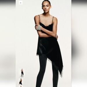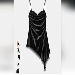 Stylish asymmetrical dress in black. Features elegant lace accents. Perfect for evening wear.