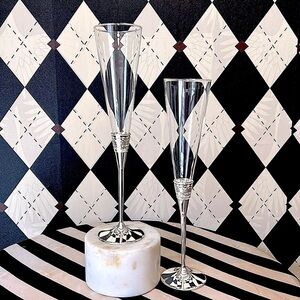 vera wang, with love collection, champagne flutes, silver plated, luxury barware, crystal champagne glasses, wedding gift, engagement gift, bridal shower, anniversary gift, elegant drinkware, designer glassware, fine dining, celebration glasses, toasting flutes, formal entertaining, timeless elegance, new in box, high-end decor, giftable item, crystal clear, modern opulence, romantic gift, collectible barware, iconic designer, heirloom quality