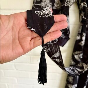 Vintage Judith Hart Fine Intimate Apparel robe in a beautiful sheer, black and white floral design. Bell sleeves, includes pockets, and comes with interior crossover tie and exterior belt with black tassels. IN EUC. 100% Polyester.