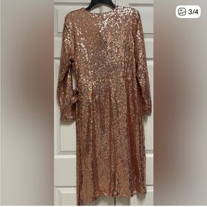 Elegant metallic pink dress with sparkling sequins. V-neck design and long sleeves. Ideal for glamorous events.