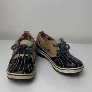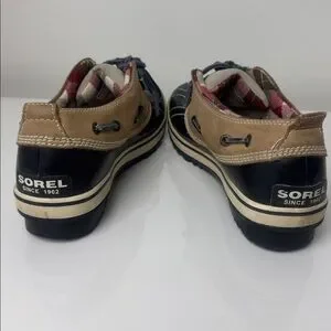 Classic and functional SOREL duck shoes designed for cold, wet weather. Featuring a waterproof black rubber lower, suede leather upper, and cozy plaid lining, these shoes offer comfort, traction, and timeless outdoor style—perfect for fall, winter, and rainy days.