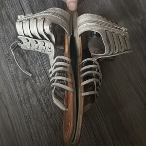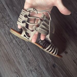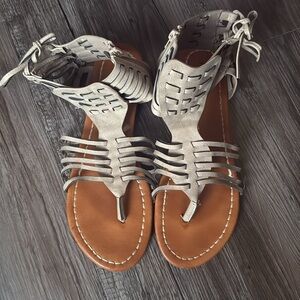 Maurice's strappy gladiator sandals in good pre-owned condition, camel faux leather sole with neutral gray/taupe faux leather upper, thong style, zip closure at ankle, functional and adjustable rope up detail at ankle, no major signs of wear outside of bottom of sole. Women's Size 10