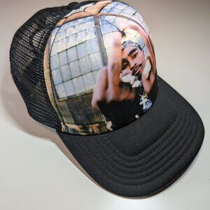 Bold snapback trucker hat featuring a Tupac graphic design.
