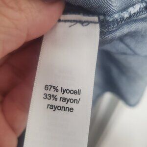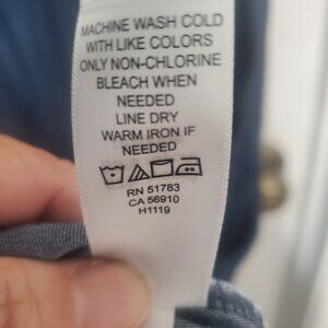 Sleeveless, v neck, button down closure at the bodice, three flowy tiers, ties added for front, or back, pullover, versatile for any occasion. Straight hemline above knee, lightweight and comfortable. 67% lyocell, 33% rayon. Dark denim color, New without tags. Women's size XL