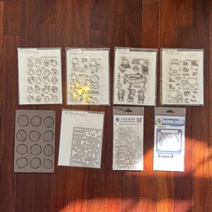Set of crafting stamps and dies. Perfect for card making and scrapbooking. Includes various designs and shapes.