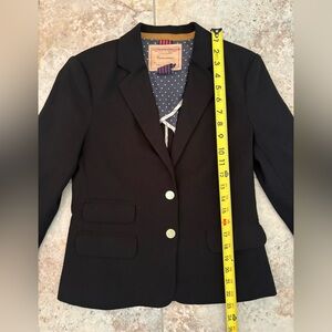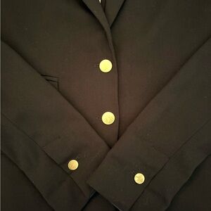 Sophisticated black blazer featuring elegant gold buttons. Perfect for professional and casual settings. Buttons are a little worn, shown in listing. Otherwise in great condition!
