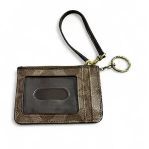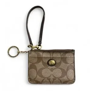Stylish Coach wristlet. Features signature pattern. Gold hardware accents. Perfect for essentials.