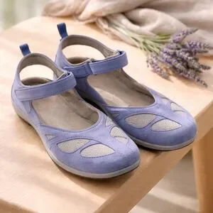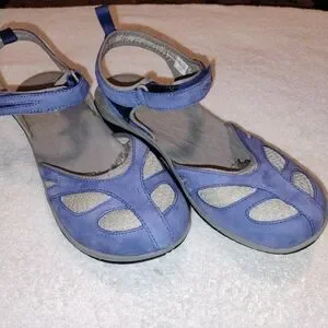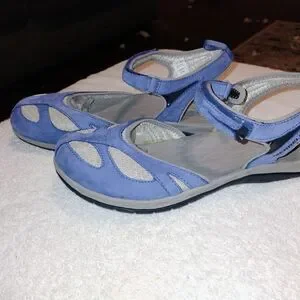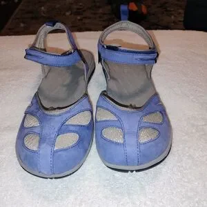 Stylish Merrell sandals. Blue upper with gray accents. Comfortable and durable design. Buckle slip thru with Velcro strap.