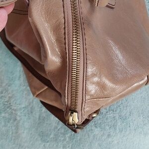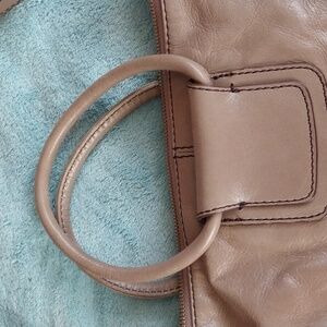 Taupe circular handles and removeable adjustable shoulder straps. Very clean.