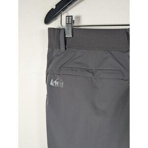 Design details: Smooth lightweight microfiber-style stretch woven shell, flat front with double button closure and zip fly, ribbed elastic panels at sides and back of waistband, belt loops, front pockets, vertical zippered security pocket at side seam, rear welt pockets (one with button), articulated knees, and reflective REI Co-op logo at back hip.