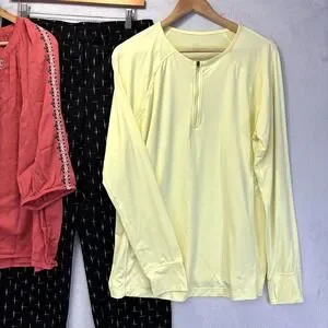 Style: Womens three-piece casual and activewear clothing lot including two tops and one pair of cropped pants, ideal for everyday outfits, travel, or mix-and-match wardrobe building.