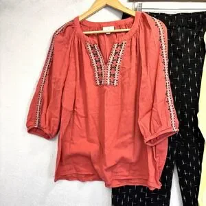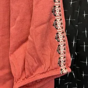Colors: Warm coral embroidered peasant blouse, soft pale yellow long-sleeve UPF top, and black cropped pants with an off-white geometric crosshatch print.