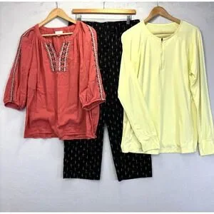 Size on tags: Both tops are Womens Large (L); pants are Womens size 10 with a relaxed, cropped trouser silhouette.