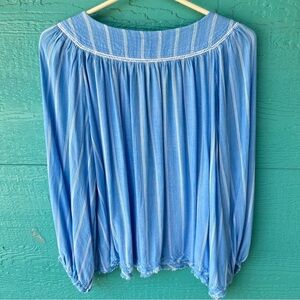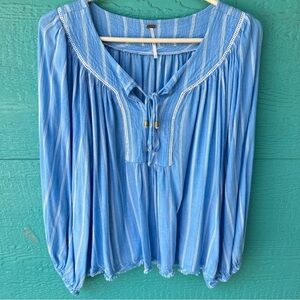 FREE PEOPLE BOHO FLOWY SKY BLUE AND WHITE STRIPED BALLOON SLEEVES TOP SI…