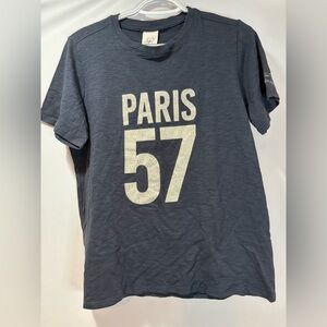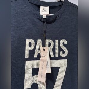 Navy tee with 'Paris' and '57' graphic. Features sparkling embellishments.