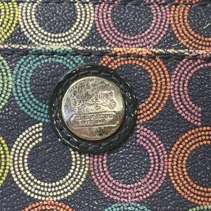 Vibrant wallet with a multicolor circular pattern. Features a zip closure and a decorative emblem.