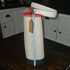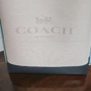 Elegant Coach tote/shoulder bag with cream body and navy base. Red and light blue trim adds a pop of color. Ideal for daily use. Canvas and leather. Brand new, never worn!