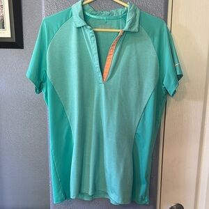 Stylish Nike top in turquoise with peach accents. Features a V-neck and short sleeves. Perfect for casual wear.