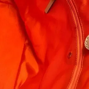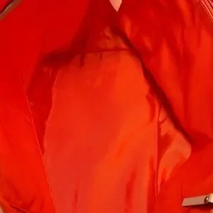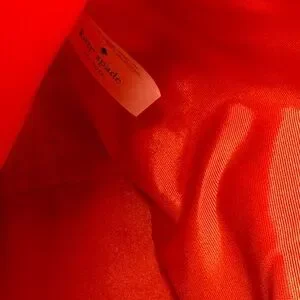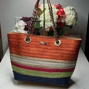 This vibrant Kate Spade tote features a striking combination of orange and red hues, crafted in straw with a durable crochet technique. The bag has leather trim up the sides, on the bottom and on the handles. Its structured design and warm color palette make it perfect for office, shopping, vacation, casual outings or beach days, offering both style and functionality.