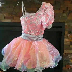 Bright and fun, this party dress features a unique animal print sequin mesh overlay on the bodice and a crystal iridescent organza topskirt with curly hem. A single puff sleeve creates an asymmetrical neckline while silver premium metallic accents the arm band, binding and cummerbund tying the whole look together. Layers of vibrant tricot add volume to the skirt. Nylon/spandex trunks attached.