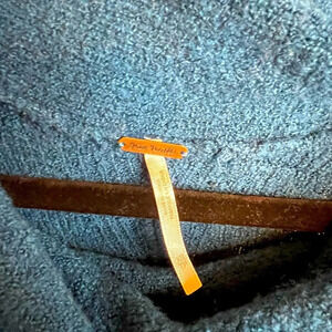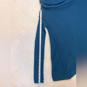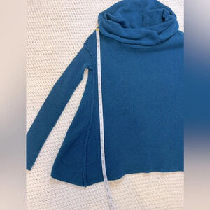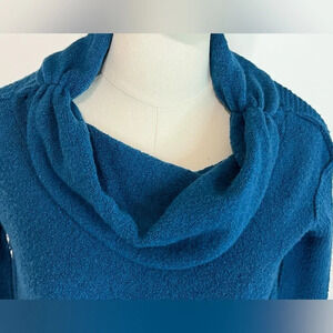 This Free People sweater has a cowl neck and a loose chest area. The sleeves are fitted and it has line detailing on the front and back. The sleeves have almost a ribbed appearance and fit. It is a beautiful almost darker teal color. It flares out at the bottom. This sweater has a bohemian look that is very flattering for the winter time. It measures 22.5 inches in length from shoulder to bottom. It measures 16.5 in width from side to side. The sleeves measures 22 inches from shoulder and down. No flaws, in great condition.