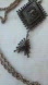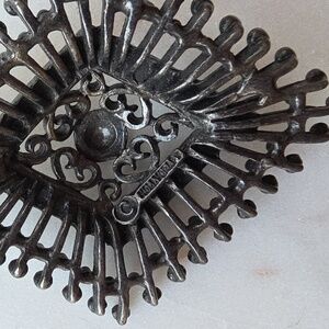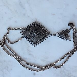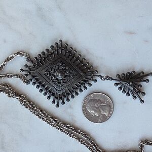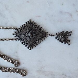 The necklace features a large, diamond-shaped medallion pendant with an articulated (moveable) tassel drop. The design is characteristic of the Brutalist style popular in the 1960s, known for its bold, sculptural, and textured appearance.
