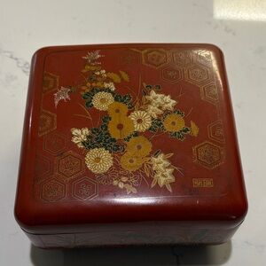 Elegant red box with intricate floral design. Features gold and green accents. Very nice condition.