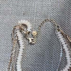 This elegant necklace features a stunning combination of white beads and gold chains, perfect for adding a touch of sophistication to any outfit.